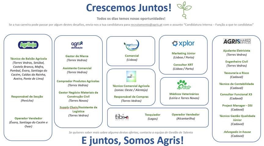 O universo do Grupo Agris continua a crescer e as oportunidades para cada um de nós também! Todos os dias lançamos novas vagas para cada uma das empresas do Grupo, que devem ser vistas por todos como oportunidades internas de crescimento, desenvolvimento ou reconversão profissional.